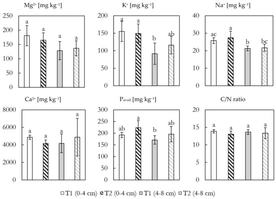 Concentrations of exchangeable ions and C/N ratio for the soil of T1 and T2 at two depths (n = 5). Standard deviation is shown with the error bars. Different letters refer to significance variations (p < 0.05). T1 refers to the control treatment.
