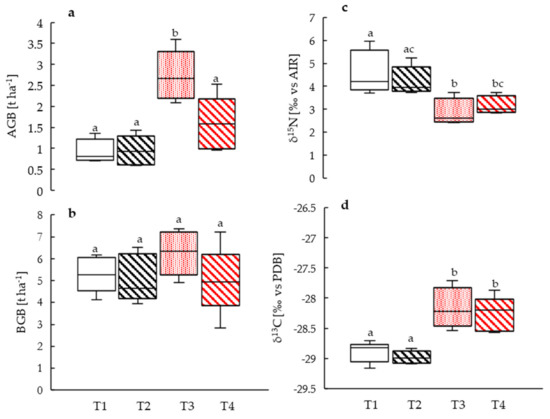 Characteristics of harvested biomass and isotopic composition of C and N in the aboveground biomass (AGB). (a) AGB, (b) belowground dry biomass (BGB), (c) δ15N values in AGB, and (d) δ13C values in AGB. The vertical line within each boxplot represents the median value. Different letters refer to significance variations (p < 0.05). T1 refers to the control treatment.