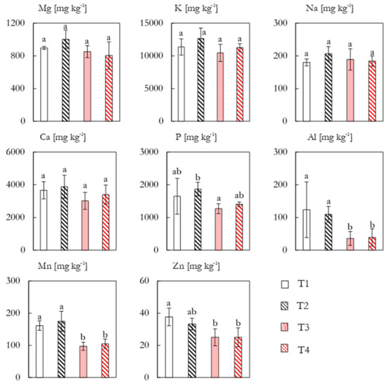 ICP-MS (inductively coupled plasma-mass spectrometry) measurements of the concentration of eight elements in the AGB. Different letters refer to significance variations (p < 0.05). Error bars denote the standard deviation. T1 refers to the control treatment.