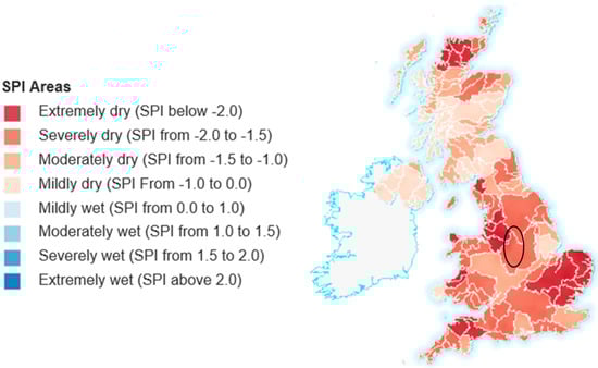 Although often considered a ‘wet’ country, the UK has experienced a number of significant annual and multi-year droughts over the past decades [19], including 1975–1976, 1983–1984, 1990–1992, 1995–1997, 2003, 2004–2006, 2010–2012 and more recently 2018 and 2019. The period May–July 2018 was the third driest for the UK (in a record from 1910), and the second driest in the east (after 1921) and north-west (after 1984) [20]. The majority of the UK registered as ‘severely dry’ or ‘extremely dry’ over this period according to the 3-month Standard Precipitation Index (Figure 1). The persistent hot, dry weather caused steep declines in river flows in responsive, largely upland, catchments, whilst dry soils and vegetation helped the spread of wildfires in northern England.