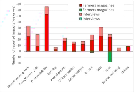This research presents empirical evidence as to the challenges facing the UK livestock sector during the 2018 agricultural drought in the UK. Twelve themes and sub-themes of impacts were identified in the livestock sector in the farmers magazines (Farmers Weekly and Farmers Guardian), covering grass productivity (growth and yields), feed availability, bedding availability, animal productivity (animal growth and milk production), farm economics (prices, costs and income), farmer well-being and Other. No additional impact sub-themes were identified during the interviews, although some, pertaining to grass productivity and farmer well-being had greater relative prominence in the farmer interviews. Figure 2 shows the frequency at which each sub-theme of drought impacts was reported in the farmers magazines and interviews. Concerns about feed availability and farm economics (prices and costs) were most commonly reported in the national farming magazines, whereas grass productivity (growth and yields) and costs were most commonly mentioned in the interviews, reflecting the fundamental importance of grassland to outdoor livestock farming and farmers. However, whilst almost 40% of total reports on prices were of positive impacts, only 7% of those on farm incomes were positive, reflecting the overwhelming negative impacts of the drought on farm business finances. Relative to the national farming magazines, farmer well-being was more commonly reported in the interviews reflecting the potential hidden personal burden of extreme events on farmers.
