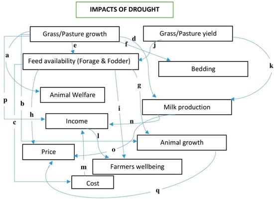 Many of these impacts are inter-related with clear dependencies evident within the reports in the trade magazines and interviews (Figure 3 and Table 1). As an example of these inter-dependencies, the lack of rain meant that grass growth was poor, leading to reduced grass quality and hay/silage yields and an inability to sell as much hay/silage as they were planning, negatively affecting income. The lack of grass, and of reduced quality, led to potentially reduced milk production in dairy herds, poor conditions of ewes (negatively affecting lambing) and reduced growth and fertility in beef herds. It was also implicated by some interviewees as contributing to increased incidences of bovine tuberculosis.