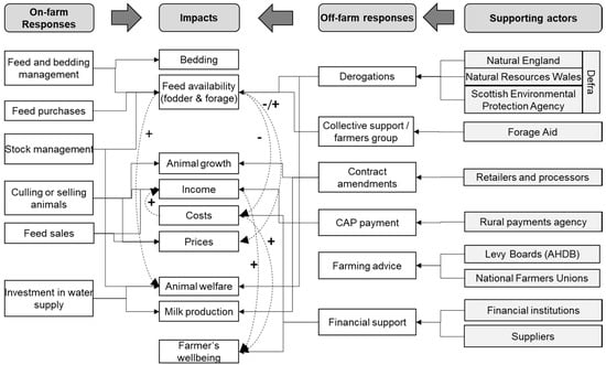 Using the impact and responses themes and insights, Figure 5 synthesises the livestock farming systems’ response to the impacts of the 2018 drought. The impact dependencies within Figure 1 means that the implemented responses in Figure 5 can reduce impacts directly (e.g., collective support will help to increase feed availability) and also lead to indirect benefits (e.g., decreased farmers’ costs and improved wellbeing). Most of the farmer-centred responses were directed towards directly and indirectly resolving the linked challenges of feed availability, animal welfare and productivity and managing finances. The supporting responses of external actors synergistically helped to reduce the overall impacts on individual businesses and the sector. For example, the multiple responses of farmers and supporting actors to increase feed availability reduce additional feed costs, thereby supporting a relative improvement in farm incomes and farmer well-being. For some farmers, those actions to increase feed availability might lead to reduced prices for feed that they planned to sell. Understanding these inter-dependencies and the systemic cascade of direct and indirect benefits of responses is important in designing effective drought response strategies.