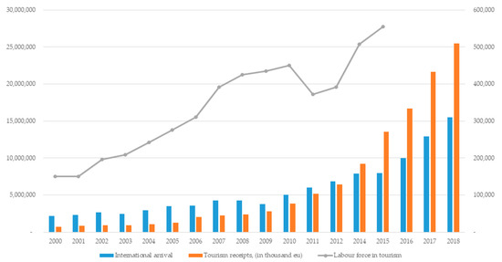Figure 1 presents the major achievements of the tourism sector in Vietnam over more than a decade. For instance, the number of incoming international tourists in Vietnam dramatically increased from more than 2 million in 2000 up to 15.5 million in 2018. This figure is far above the 2020’s objective stated in Vietnam’s tourism development strategy until 2030 [11,13]. The growth in the number of tourists significantly contributed to the increase in the industry’s receipt in the same period. As shown in Figure 1, tourism receipt has brought about €25.48 billion in 2018. The direct contribution of the tourism sector to the GDP of Vietnam has increased from 6.33% in 2015 to about 8.39% in 2018 [11,14]. In terms of job creation, Figure 1 shows that the tourism sector has created more and more jobs over the years. Employment in this sector concentrates in the field of accommodation services, food, and beverage services [13].