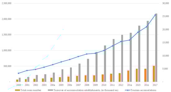 The growth of tourist accommodations in Vietnam from 2000 to 2017. Source: Data was adapted based on Vietnam National Administration of Tourism (VNAT)’s reports [11,15,16,17] and General Statistics Office of Vietnam.