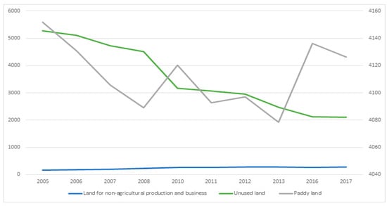 At the national level, the conversion of agricultural land to non-agricultural land has decreased the land for paddy field areas, as shown in Figure 3. This observation is quite consistent with Vo et al. (2018), who reported that, from 2010 to 2014, paddy land areas in 32 provinces of Vietnam have significantly decreased due to the acquisition and conversions of agricultural land for urban developments or other non-agricultural developments. After 2013, the area for paddy land increased again. Although strong empirical evidence is lacking, we believe that this might be partly due to the fact that developers faced greater challenges in negotiations with farmers to acquire agricultural land (see Section 3.4).