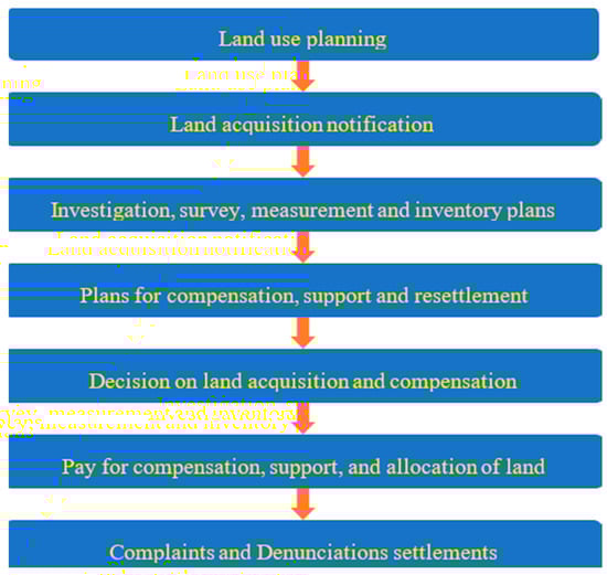 Obviously, the unclear differences between public investment purposes and private investment purposes may cause many social conflicts, because it favours the position of private investors [4,30]. In order to reduce the tension between local communities and the government regarding this issue, the 2013 Land Law was introduced. In this law, land acquisition by the State can only be conducted to accommodate national or public interests which include national defence, security, and socioeconomic development. Compulsory land acquisition cannot be implemented anymore to accommodate economic projects by private investors. The public interests should be included in the land use plan, and then a land acquisition plan should be issued by the government. The affected people must be notified about the plan before an investigation, survey, and measurements to implement the plan are carried out, including the amount of compensation to be paid, support and a resettlement plan for the affected people (see Figure 4). Although the law already stipulates that compulsory land acquisition can only be implemented to accommodate projects that are considered as public purpose and interests, in practice until now, there remains a dispute over how to define the public purpose and interest [48].
