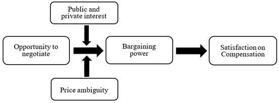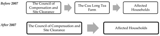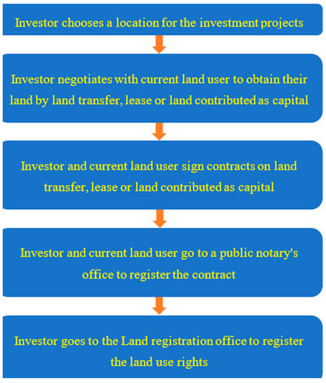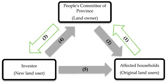 The 2003 Land Law introduced a self-negotiation mechanism in land acquisition processes [51]. According to this mechanism, investors directly negotiate with the current land users without the intervention of government, to acquire land for a development project (see Figure 5). Arguably, this mechanism creates some advantages, especially for affected local communities in a land acquisition process, since they can ask for a higher price for their land than the land price that is set by the government. At the same time, since the government cannot intervene in this process, it causes development delays or leads to stalled projects due to the impact on the developer’s profits.