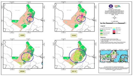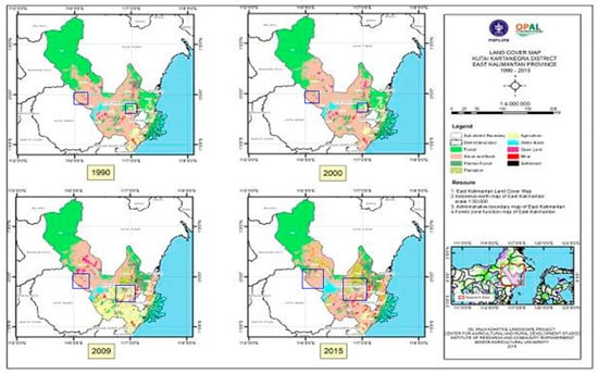 To understand land-cover change, Landsat images covering Kutai Kartanegara district were also used. The method was the same approach used as the national method for land-cover analysis, namely, SNI 764,591:2014, the method used formally by the Ministry of Environment and Forestry and the Geospatial Information Agency of the Republic of Indonesia. The classification method is based on 23 land-cover classes, and was used in this research to examine spatial patterns of expansion and land-cover changes between 1990 and 2015. Other secondary data analyzed and superimposed on the interpreted map included land-cover and forestland maps produced by the Ministry of Environment and Forestry of the Republic of Indonesia, specifying different forest zones in East Kalimantan. We also used administrative boundaries and a base map at the scale of 1:50,000 to guide our analysis.