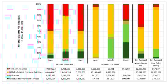 Figure 5. The income structure by strata in the villages of Muara Kaman Ulu and Long Beleh Haloq. (Source: primary data, 2016).