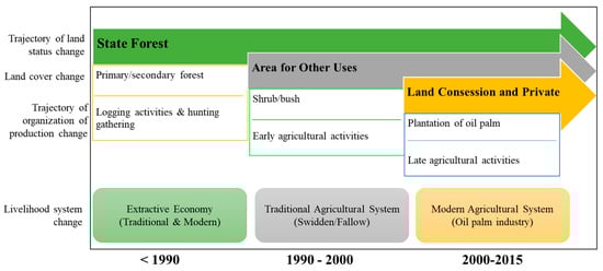 As illustrated in Figure 2, the land-cover change towards oil palm plantations took place gradually. The land was converted from primary forest into secondary forest or shrubs and bushes after being abandoned by logging companies once their concessions expired. Secondary forests and bushes were usually turned into open land or cropland, which were then converted into plantation land.