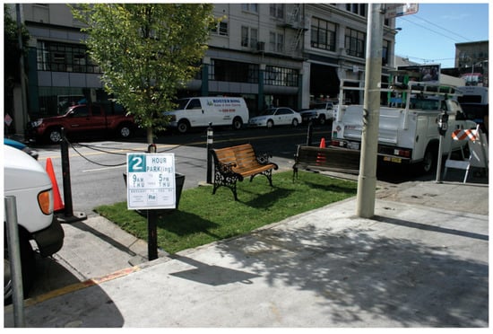 - Pratt, L. Parklet Impact Study; San Francisco Great Streets Project; City and County of San Francisco: San Francisco, CA, USA, 2011. [Google Scholar]