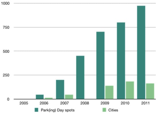 Activists from Rebar group tackled one parking spot at a time, but “the combination of the iconic image of parking-space-as-park and its accompanying descriptive name created a ‘sticky’ idea that transmitted readily across electronic media” []. In 2006 this ephemeral installation grew into a movement named “Park(ing) Day” (PD) which was aimed specifically at drawing attention to the lack of green space in the downtown area of San Francisco [], and with a wider scope, debating the appropriation of urban space. The event quickly became an officially supported endeavor; San Francisco Mayor Gavin Newsom allowed activists to take over his private parking space []. The number of PD spots grew rapidly into a global event on six continents and thirty-five countries [] (Figure 2). PD is one day a year, but the images, videos, website, articles and other forms of documentation enable constant dissemination and the ‘virality’ of the idea [].