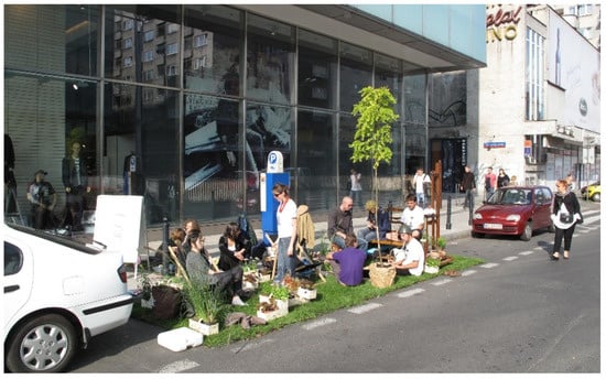 Park(ing) Day, an attractive idea with great potential for capturing imagination on a global scale has been appropriated by all of these strategies and used as a case study that supports them. Park(ing) Day is an example of urban acupuncture: a practice that targets local points of significance, while attempting to heal or “energize” the larger urban space or the whole city []. It definitely was a ‘do it yourself’ (DIY) project instigated, designed, created, paid for and implemented by single users or small voluntary groups []. It is a form of insurgent urbanism and guerilla action, in opposition to the conventional practice of urban planning, and in defiance of official rules and regulations [].