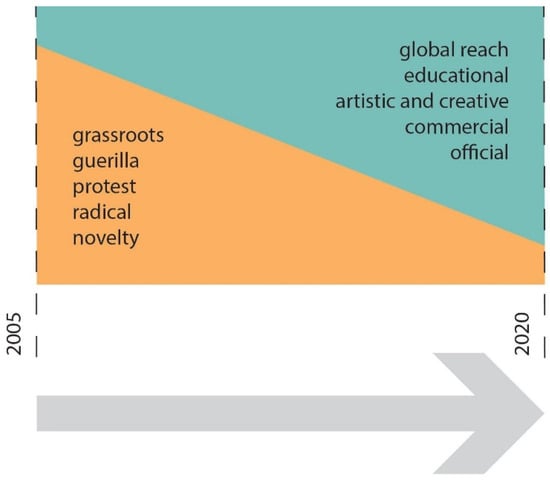 The typical progress of institutionalisation included two to four stages where PD was: independently organised by activist groups (1), officially permitted by city councils (2), financed by city councils (3) and organised by city officials (4). In the analysed cases, once the organisation of the event is taken over by the city council or financed by the city it never goes back to the scale and grassroots character of the original guerilla, activist action. Municipalities and city councils have come to look at grassroots actions such as PD for inspiration and also to entice social involvement, activity and progress their political agenda (represented by urban development strategies).