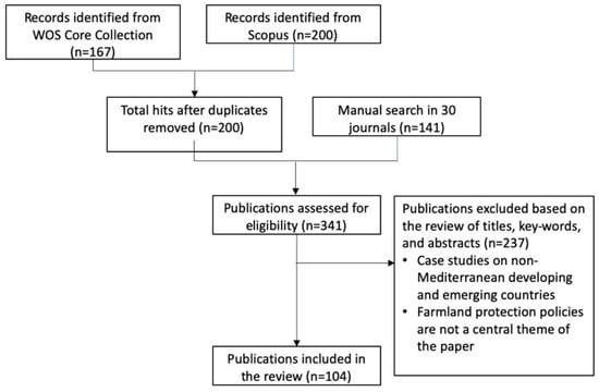| 1 | In the SCOPUS database, we found 200 references through the query: (TITLE-ABS-KEY (“farmland preservation” OR “preservation of farmland” OR “farmland conservation” OR “conservation of farmland” OR “farmland protection” OR “protection of farmland”) AND TITLE-ABS-KEY (*urban*)) AND SUBJAREA (mult OR agri OR bioc OR immu OR neur OR phar OR mult OR arts OR busi OR deci OR econ OR psyc OR soci). In the WOS database, we found in May 2020 167 references through the query: (TS = (“Farmland preservation” or “preservation of farmland”) AND TS = (*urban*)) OR (TS = (“farmland protection” or “protection of farmland”) AND TS = (*urban*)) OR (TS = (“farmland conservation” or “conservation of farmland”) AND TS = (*urban*)). Indexes = SCI-EXPANDED, SSCI Timespan = All years. |