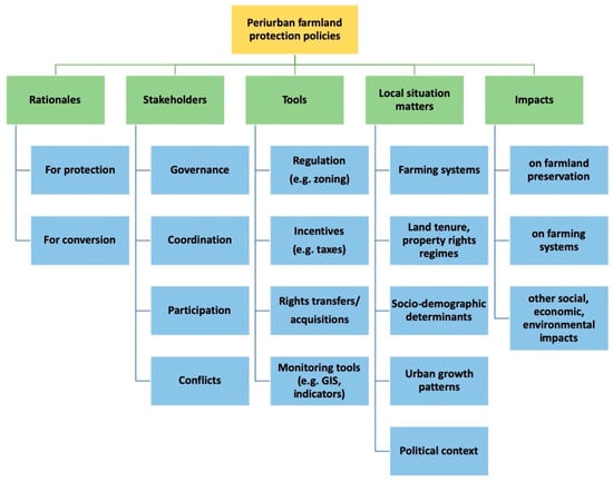This review highlights that FP cannot rely merely on transferring policy tools that have proven successful elsewhere. It also reveals that farming systems tend to be neglected by FP policies, as these often focus on land rather than on agriculture. FP policies do not always take into account the specific features of the local context and farmers’ need for long-term guarantees if they are to invest and develop their activity on the urban fringe. Our review maps several interesting areas of research on the diversity of FP rationales, as well as the barriers and potential avenues for policy improvement. This may be of interest to students and scholars, but also to practitioners, policy makers and local groups looking for innovative, more flexible or locally suited farmland preservation programs.