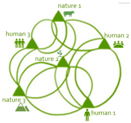 Relationality is a key feature of SES [23,24,25]. This means that systems are relationally constituted, i.e., they are what they are by virtue of the multiple, dynamic relations or interconnections which link the elements of a system together. In other words, the nature and functioning of SES are strongly shaped by the nature of the web of relationships in that system. This is not to say the nature of the elements is not relevant, but rather that the system emerges out of both the elements and the relations among them [25]. These relationships are between all kinds of elements of the system, e.g., human-to-nature, nature-to-nature, human-to-human, human-to-nature-to-nature, and so on, forming a web of relations (Figure 1). By foregrounding relationships, we can gain a better understanding of the “rich ground of practice that guides a system in ways that the formal rational designs do not explain” [24] (p. 1).
