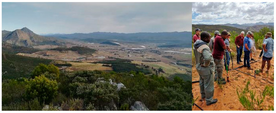 The Langkloof is situated in the Eastern Cape Province, South Africa. It is an agricultural area which mostly consists of commercial fruit production [64]. The landscape is socially and ecologically heterogeneous, with high diversity in terms of the economic, socio-cultural, and political background of people living in the landscape (Figure 2) [17]. Social groups are dynamic and diverse in ethnicity. There is contestation around access to land and water resources among historically disparate groups, i.e., ‘white’ commercial farmers and ‘coloured’ people whose ancestors were dispossessed of land [17]. The area has high biodiversity with many endemic species. The case presented here is based on the work of a local not-for-profit company, Living Lands, who facilitate collaborative landscape stewardship activities across the landscape [17,65,66].