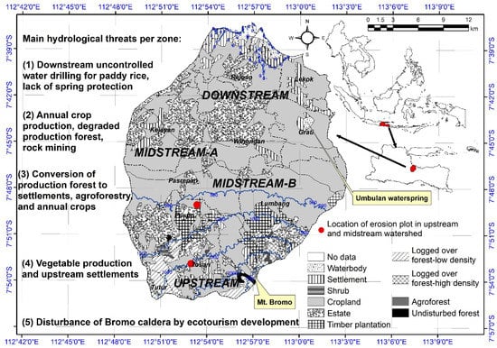 The Rejoso Watershed, is located on the northern slope of Mount Bromo, covering 16 sub-districts in Pasuruan District, East Java Province, Indonesia. The Rejoso Watershed is located between 7°37′13.35″ and 7°55′18.63″ South, and between 112°48′32.51″ to 113°55′55″ East (Figure 1).