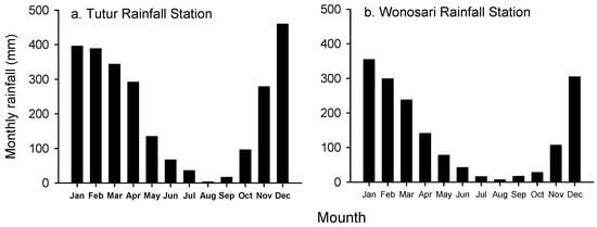 Monthly rainfall distribution in the Rejoso Watershed from the average of 24 years of rain events (1990–2013) in the (a) upstream (Tutur Rainfall Station) and (b) midstream (Wonosari Rainfall Station).