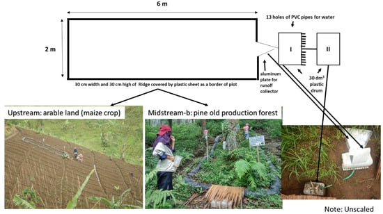 Water infiltration was quantified in each land cover type via its complement, surface runoff, and expressed in the runoff/throughfall ratio. As the throughfall for quantified infiltration was measured below the tree canopy, the amounts were the net of canopy retention and possible stemflow. Surface runoff was measured in 6 m × 2 m plots protected from surface run-on, with two drums at the lower end to collect surface runoff and sediment concentrations for soil erosion measurements (Figure 3).