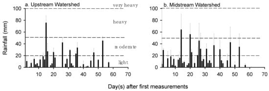 Within the measurement period, 31 rainy days were recorded (Figure 4). Rainfall variation between the upstream and midstream observation plots was relatively high, with an average of 520 mm (range 476–556 mm among 12 rain gauge measurements), and an average of 666 mm (range 541–840 mm among 12 rain gauge measurements), respectively. In the upstream and midstream areas, 71% and 57% of the rainy days had < 20 mm day−1 (“light rain”), 24% and 31% had “moderate” rainfall (21–50 mm day−1) and 6% and 13% “heavy” rain (51–100 mm day−1), respectively; none had “very heavy rain” (>100 mm day−1). Such rain conditions indicate that the rain erosivity in the midstream is higher than that of the upstream.