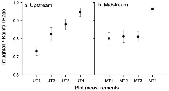 The throughfall/rainfall ratio variability in measured runoff plots (a) upstream, (b) midstream.