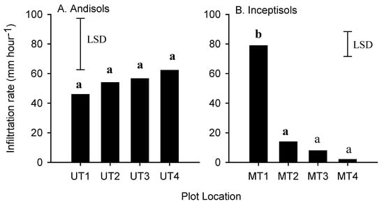 Soil infiltration rate measured using a double-ring infiltrometer (n = 6).