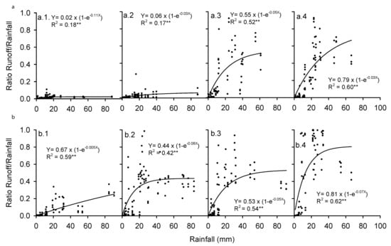 The relationship between surface runoff/rainfall ratio and the amount of rainfall in production forest and agroforestry systems in (a) the upstream Rejoso Watershed, under (a.1) 55% canopy cover of pine-based old production forest, (a.2) 40% canopy cover of pine-based young production forest, (a.3) 5% canopy cover of Casuarina-based agroforestry with cabbage crop, (a.4) 0% tree canopy cover of arable land (maize crop); (b) the midstream Rejoso Watershed under (b.1) 87 % canopy cover of pine/mahogany-based old production forest, (b.2) 75% canopy cover of coffee-based agroforestry, (b.3) 52% canopy cover of clove-based agroforestry, (b.4) 26% canopy cover of mixed tree and crop-based agroforestry.