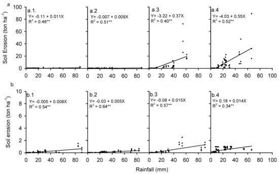 Soil erosion in relation to daily rainfall rates in production forest and agroforestry in (a) the upstream Rejoso Watershed, under (a.1) 55% canopy cover of Pine-based old production forest, (a.2) 40% canopy cover of pine-based young production forest, (a.3) 5% canopy cover of Casuarina-based agroforestry with cabbage crop, (a.4) 0% tree canopy cover of arable land (maize crop); (b) the midstream Rejoso Watershed under (b.1) 87% canopy cover of pine/mahogany-based old production forest, (b.2) 75% canopy cover of coffee-based agroforestry, (b.3) 52% canopy cover of clove-based agroforestry, (b.4) 26% canopy cover of mixed tree and crop-based agroforestry.