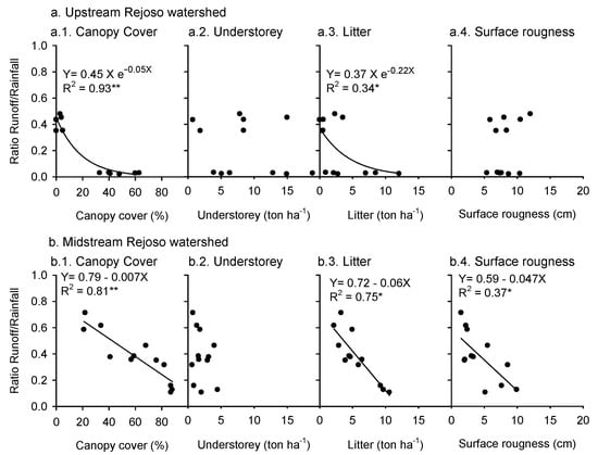 The runoff/rainfall ratio as a function of tree canopy cover, understory vegetation, litter necromass, and land surface roughness in the (a): upstream, (b): midstream.
