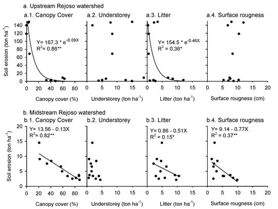 Soil erosion in relation to tree canopy cover, understory vegetation, litter necromass, and land surface roughness in the (a): upstream, (b): midstream.