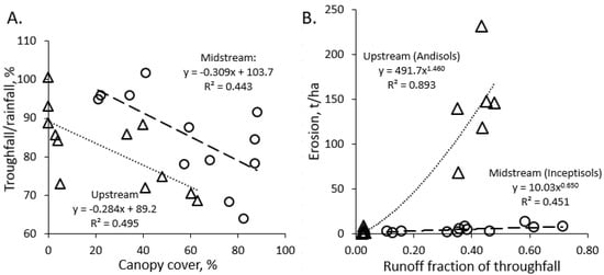 Our study only covered two months’ worth of data, rather than the recommended 3–5 years for such studies. Measurements included one-fourth of the mean annual rainfall, and the validity of the result may be primarily limited by the assumption that it represented a fair sample of the rainfall intensities that can be expected in the landscape. With a disproportional fraction of erosion normally associated with extreme events (compare the curvature of responses in Figure 11B), scaling up our comparison among land cover types to a multi-year basis may underestimate the relevance of controlling overland flows.