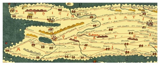 - Talbert, R.J.A.; Elliott, T.; Harris, N.; Steinmann, M. Rome’s World. In The Peutinger Map Reconsidered, 1st ed.; Cambridge University Press: Cambridge, UK, 2010; ISBN 9780521764803. [Google Scholar]