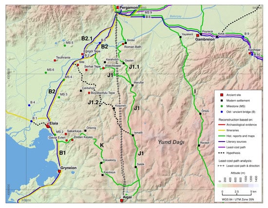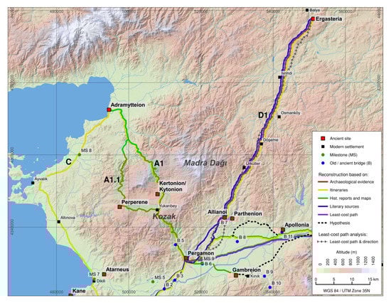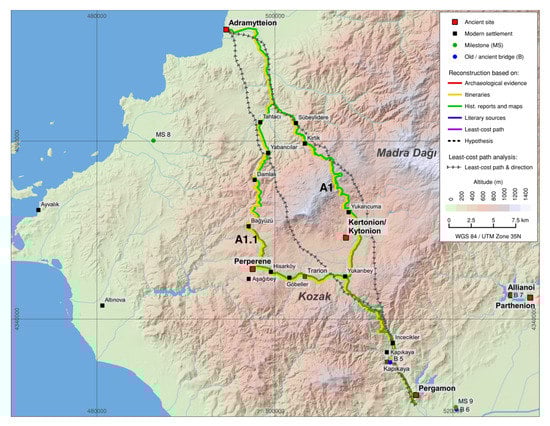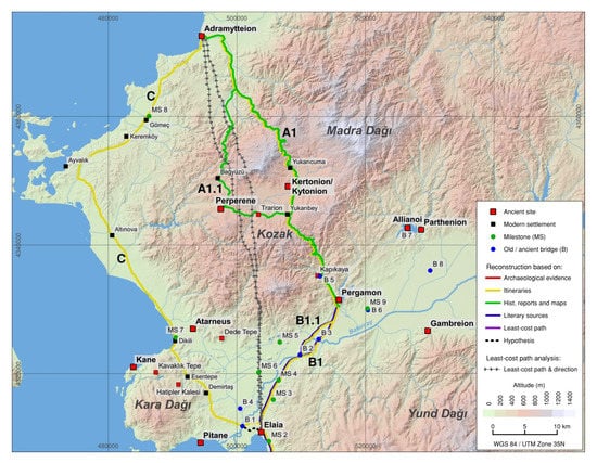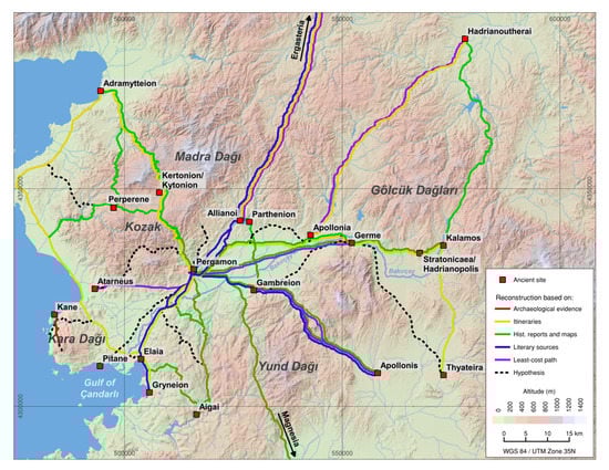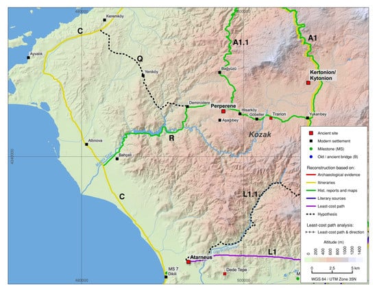 The calculated least-cost path from Pergamon to Adramytteion runs west of the northern Kozak ridges (Figure 6). Ernst Fabricius [61] also assumed an ancient route via Perperene, one of the most important settlements in the Kozak Mountains (cf. [62] (pp. 296–309) with additional literature). Together with Richard Bohn [61] (p. 2), he considered Perperene as well as Kytonion to be important fortresses securing the roads from Adramytteion to Pergamon.