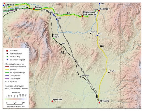 The distance of 25 miles (37.04 km) mentioned in the itineraries correlates with the calculated least-cost path between Pergamon and Germe (40.85 km). According to these data, the route must have gone almost straight along and south of the former riverbed through the eastern lower Bakırçay Valley (Figure 7). This hypothesis is only supported by the map of Heinrich Kiepert [41], on which such a route can be seen. The route crosses the Bakırçay River north of the modern village of Dağıstan and leads south along the old river through the valley to Soma (Germe).