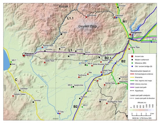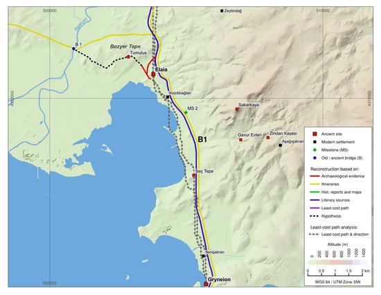 The exact course of the route is difficult to reconstruct. Geo-archeological studies [6,8,9], have shown that the landscape of the lower Bakırçay Valley has changed considerably up to the present day and that the river has repeatedly shifted its bed in the past. The riverbed of the Bakırçay River and its tributaries has also been partially relocated, straightened, or canalized (see study area), and these activities have caused the disappearance of old paths or evidence of monuments such as ancient bridges.
