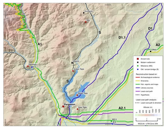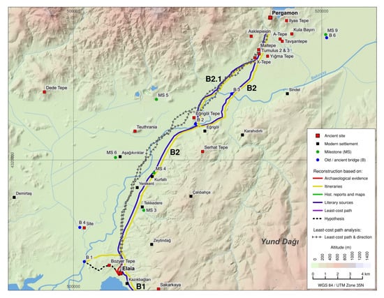 There is no archeological evidence so far for a second parallel route connecting the western Kozak Mountains and Perperene with Pergamon [62] (pp. 304–305). However, such a route can certainly be assumed, especially since the area around Perperene contained numerous resources such as wood [3] (p. 19), granite, marble ([19] (pp. 148–151), [62] (pp. 303–304), [63]), and ores (Strabo 13.1.51 [64], [19] (p. 148)) that could be brought to Pergamon via these routes.