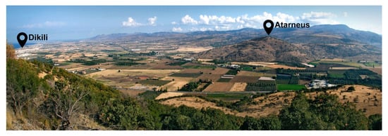 The entire plain of the lower Bakırçay Valley was significantly affected by fluvial erosion and deposits of the river [6]. In the area around the Yeni Yeldeğirmentepe, approximately 3.5 m of sediment have been deposited since the Bronze Age [7] (pp. 183–188). In the area 1.5 km east of Kalarga Tepe (Teuthrania) (Figure 2), geo-archeological research was able to prove that the terrain was 1.7–2.0 m lower in antiquity than today [6]. Near Atarneus and the Geyikli Valley, the sedimentation in the past 1950 years is at least 6 m [8,9]. After the Bakırçay River was regulated and dammed up in the last century, the landscape changes caused by the river are now only minimal. Larger changes result from the intensive agricultural use of the plain in recent years.
