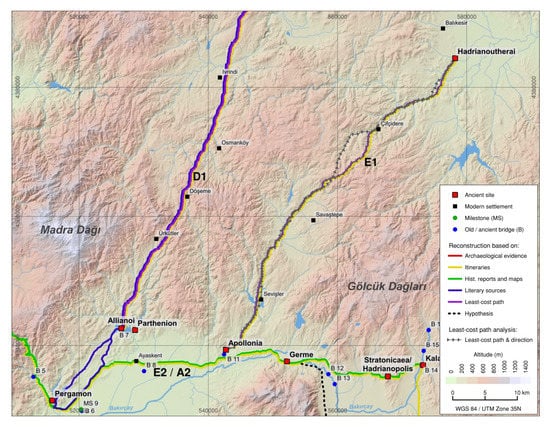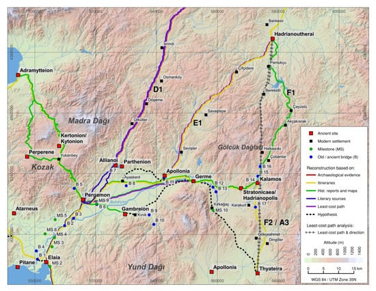 - Külzer, A. Von Assos nach Pergamon und Ephesos: Betrachtungen zu den Straßen Westkleinasiens in römischer und byzantinischer Zeit. In Assos: Neue Forschungsergebnisse zur Baugeschichte und Archäologie der südlichen Troas; Arslan, N., Mohr, E.-M., Rheidt, K., Eds.; Dr. Rudolf Habelt GmbH: Bonn, Germany, 2016; pp. 185–204. ISBN 9783774939516. [Google Scholar]