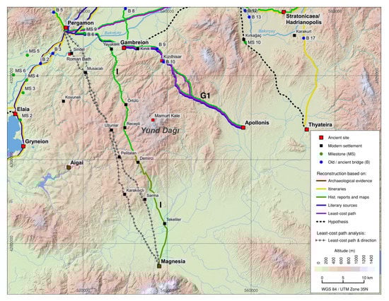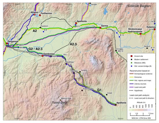 Calculated least-cost paths and reconstructed routes between Pergamon and Germe.