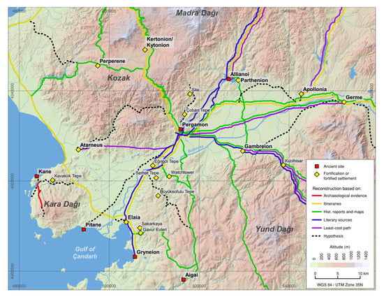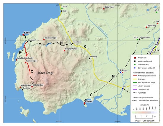Only well-documented archeological records of road infrastructure provide a reliable basis for study. The sole proven remains in the area around Pergamon were found during field surveys on the Kane Peninsula ([16] (pp. 184–185), [17] (p. 151)). From Kane up into the Kara Dağı Mountains, a paved road leads to the tower houses of Asarlık Tepe and Söğütlü Kale ([18] (pp. 211–213); [19] (p. 119)).