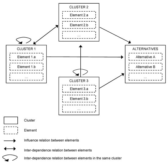 The Analytic Network Process (ANP) is a special method of the wide set of multi-criteria analysis methods (MCA). ANP is often used to analyze complex issues related to the decision-making process, due to its power to deal with qualitative and quantitative attributes and to identify the relationships between decision elements [51,52,53]. It is recognized as a generalization of the Analytic Hierarchy Process (AHP) [54,55,56]. Generally, multi-criteria techniques are based on the principle of independency of the elements involved in the evaluation. In contrast, the peculiarity of the ANP is its capability to identify and to consider the mutual dependencies between the criteria of the evaluation process [57,58,59]. In detail, the interrelations that occur between the elements are defined as “feedbacks”. The basic structure of the ANP is represented by a network of clusters and nodes, i.e., the elements, that are contained in the clusters (Figure 1). The clusters represent both the criteria and the alternatives [53].