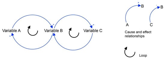 In detail, this section describes the phases of creating a basic structure of causal graph and a system dynamics flow graph. The basic structure of a causal graph is represented by the causal loop diagram (Figure 3) [78]. This diagram is used both to recognize the mutual influences which occur among the variables of the systems and to develop the feedback loops [45,69,74]. The processing of the causal loop diagram is the first phase to describe the dynamic behavior over time of the complex system [38,82]. Moreover, the mutual influences among variables can be either positive or negative [67]. A positive relationship means that the two variables will change in the same way. As an example, if variable A increases, then variable B will also increase. Within a negative relationship, the variables will change inversely. For instance, if variable C increases, variable B will decrease. Figure 3 illustrates a general structure of the causal loop diagram, identifying its main elements.