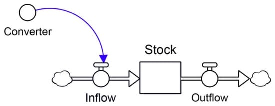 The evolution dynamics of the system is represented by stocks and flows diagrams in Figure 4 [9,10,26]. Specifically, stocks stand for those variables that both describe and characterize the state of the system at any particular time [45,69,83,84]. The second elements of the SDM are flows. These elements illustrate how stocks can change over time [67]. Furthermore, flows can impact stocks via the inflow or outflow and also interconnect the stocks within a system [68]. The final element of SDM model are the conveyors that represent the external inputs to the model. In fact, they are also used to represent different actions for the policy simulation and analysis [46,67]. Figure 4 illustrates the basic elements of a stock and flow diagram.