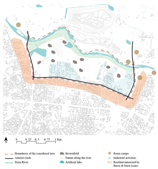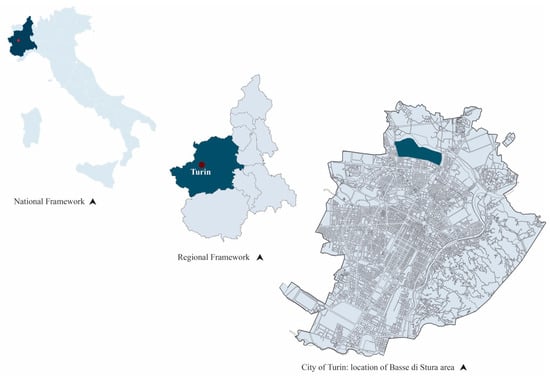 The approach illustrated above was applied to analyze the area of Basse di Stura, located in Turin (Northern Italy) (Figure 5). This area extends over 150 hectares and it is delimited by three main arterial roads and by the Stura river (Figure 6). The neighboring areas of Basse di Stura count 126,666 inhabitants. It is considered a critical part of the city of Turin due to its social and environmental conditions [85], meaning any serious threat would be a major concern for a large part of the city’s community [86,87].