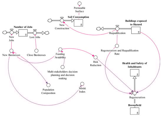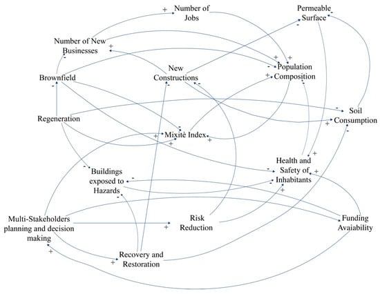 Once the indicators have been identified, the subsequent step consists of the implementation of the SDM. The first phase is to build up the causal loop diagram (Figure 9). The causal loop diagram (Figure 9) has been processed during an expert focus group, in which the basis of the cognitive mapping was recalled [82,91]. In fact, experts were asked to identify the mutual relationships among the considered indicators (Table 2), while also considering their mutual influence [46]. In detail, this diagram has been built both on the literature review on urban dynamics [78,92,93] and on the experts’ knowledge. Figure 9 illustrates the causal loop referred to the Basse di Stura area, in which the relationships among social, economic, environmental and governance indicators have been identified. As an example, the variable “Soil Consumption” has a negative influence on “Permeable Surface”.