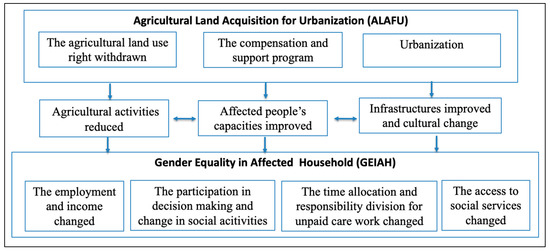 Gender equality is one of the important components of sustainable development [15,16]. It relates closely to agricultural land accessibility [17] and urbanization [18,19]. In fact, the Food and Agriculture Organization (FAO) has stated that unequal access to land resources between men and women, which is common in rural areas, has hindered progress toward rural gender equality [20]. Additionally, according to Frank Ellis (2000), access to land is the most important asset of rural people. In many cases, it is a valuable unique asset for their livelihoods [21]. Hence, losing access to land has a direct impact on their livelihoods, causing a change of gender-based income and labor division in the family. In addition to the loss of access to agricultural land, urbanization has gradually merged the affected rural communities into urban areas [22]. One study revealed that urbanization has worsened the female dual-burden of paid and unpaid work, and that the sharing of unpaid work within the family has increased for males [18]. A second study via United Nation Women (UNW) concludes that urbanization does not yet advance gender equality [16]. Both papers do not consider gender equality in affected households (GEIAH). Another recent study shows that ALAFU has contributed to improving the socio-economic status of women in affected households, [23] but this is not enough evidence to conclude that GEIAH has generally improved. Unfortunately, the above-mentioned studies have not adequately considered GEIAH, therefore research on the benefits and constraints of ALAFU for GEIAH could significantly contribute to sustainable development in both urban and rural areas.