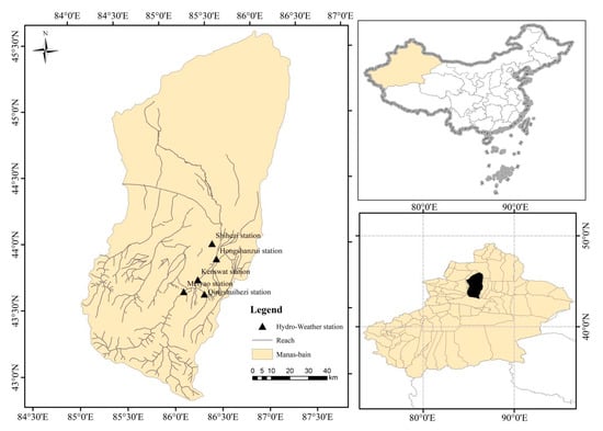 The Manas River Basin in Xinjiang is situated between 43°5–45°58′ N and 84°42–86°33′ E, originating from the northern side of the Tian Shan Mountains (Figure 1). From south to north, the area features alpine glaciers, forests, meadows, an alluvial fan and alluvial plain and deserts.